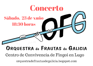 La Orquestra de Frautas de Galicia ofrecerá el próximo sábado, 23 de junio un concierto a las seis y media de la tarde. El concierto tendrá lugar en el Centro de Convivencia de Fingoi enLugo y la entrada es gratuita. El director de la OFG es Salvador Espasa.